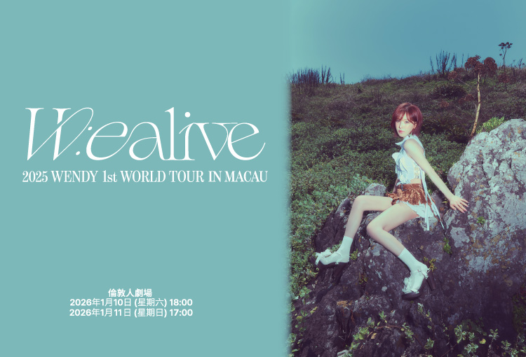 WENDY首次個人世界巡迴《W:EALIVE》登陸澳門!以溫暖歌聲與驚艷舞台,呈現多彩音樂世界。這是一場充滿生命力的音樂盛宴,與WENDY共同創造難忘回憶!