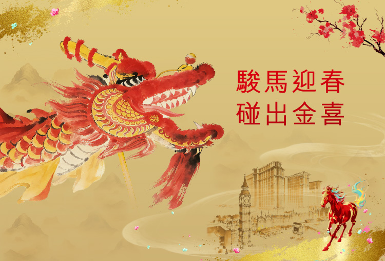 蒞臨澳門倫敦人,喜迎豐盛馬年,碰出好運, 碰出一系列金喜及禮遇。融入新春吉祥氛圍,探索國際奢華品牌的限量賀歲臻品。品味廚師們隊融合傳統與創意的賀年盛宴,參與豐富多彩的節慶活動,盡享購物尊榮與歡樂時光,開啟一個馬到福來、富貴吉祥的新年。